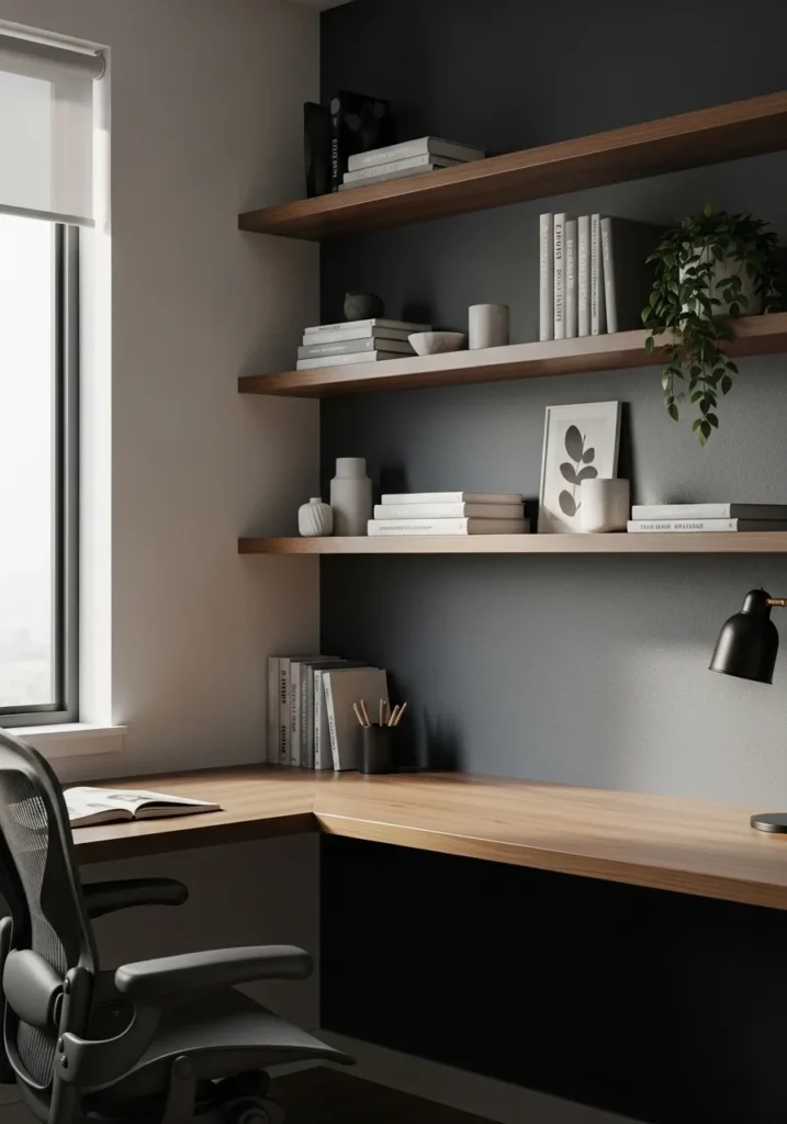 This office pairs soft cool gray walls with warm wood floating shelves, creating a balanced and modern look. The muted gray backdrop feels clean and polished, while the natural wood tones add warmth and texture. A sleek desk with a matching wood top anchors the corner beneath a large window that lets in gentle daylight. Minimal decor and neatly styled shelves keep the space uncluttered and functional.