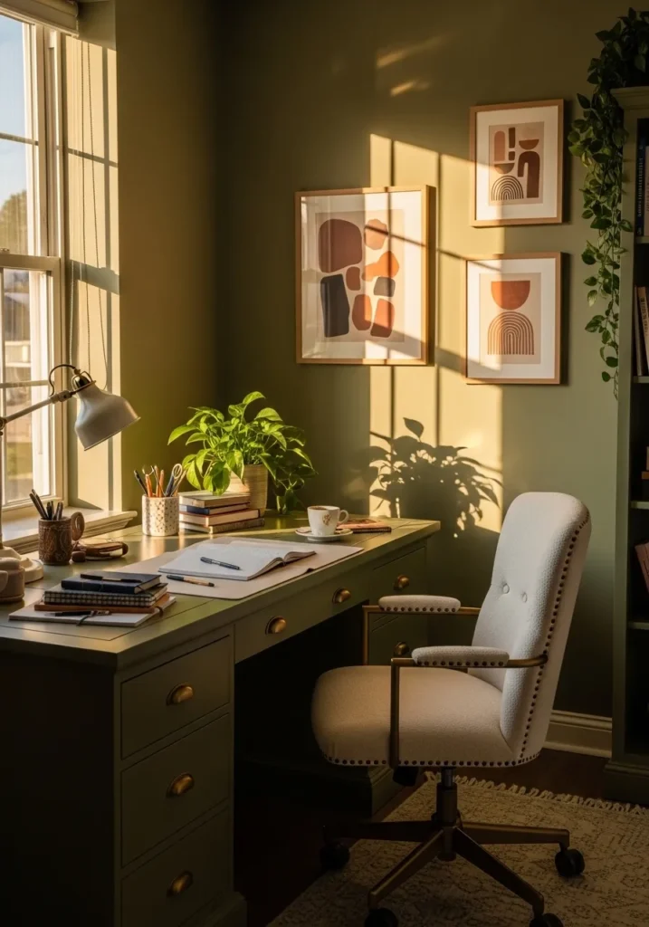 This office wraps the room in a rich olive green that instantly feels cozy and grounded. Warm sunlight pours through tall windows, casting golden reflections across the walls and highlighting framed artwork above the desk. The muted green desk blends beautifully with the walls, creating a cohesive look. Soft textiles and leafy plants add life and a relaxed charm.