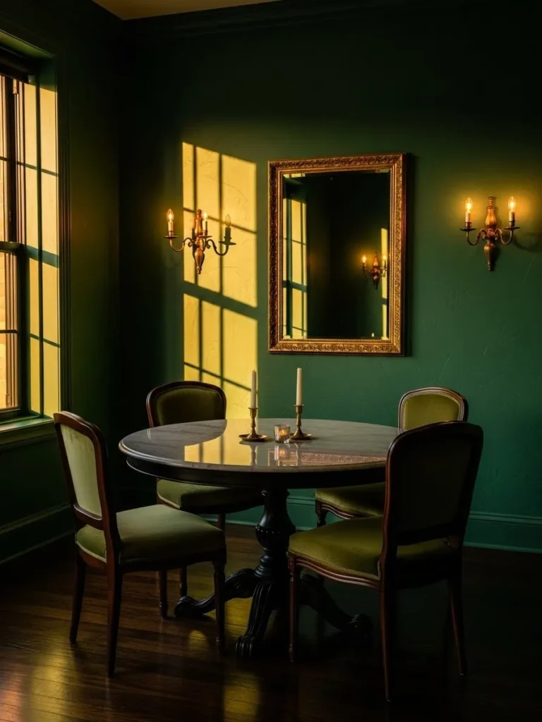 This dining room leans into deep emerald green walls paired with warm lighting and traditional details. The small round table and upholstered chairs create a cozy setup that feels intentional rather than cramped. Soft wall sconces and a vintage mirror add warmth and reflect light gently around the room. Everything feels balanced and calm without trying too hard.