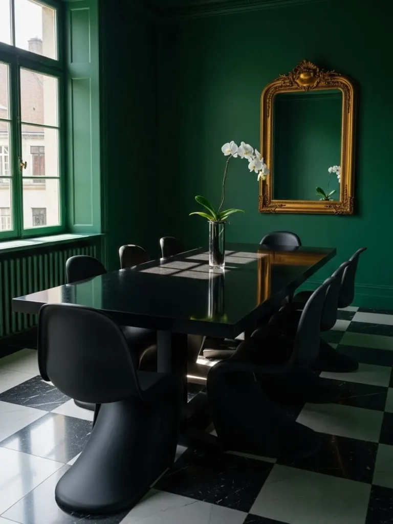 This dining room pairs deep emerald green walls with a sleek black dining table and sculptural chairs. A vintage style mirror adds contrast and reflects light around the room. The darker elements create a moody and modern atmosphere. The checkered floor adds visual interest without competing with the walls.