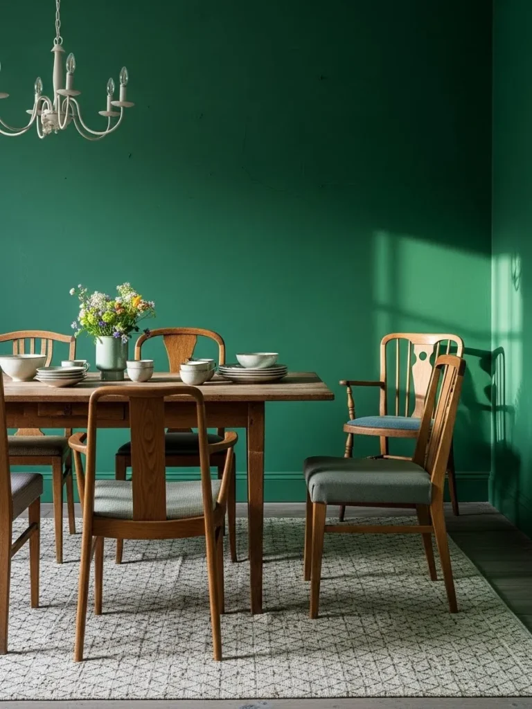 This dining room combines emerald green walls with classic wooden chairs and a soft patterned rug. The furniture feels timeless and slightly vintage. Natural light highlights the texture of the walls and furniture. The room feels elegant without being formal.