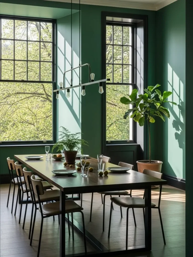 This dining room is filled with natural light that pours through large windows and brightens the emerald green walls. A simple table and chairs keep the focus on the color and the view outside. Plants add a fresh and organic touch to the space. The room feels open, calm, and connected to nature.