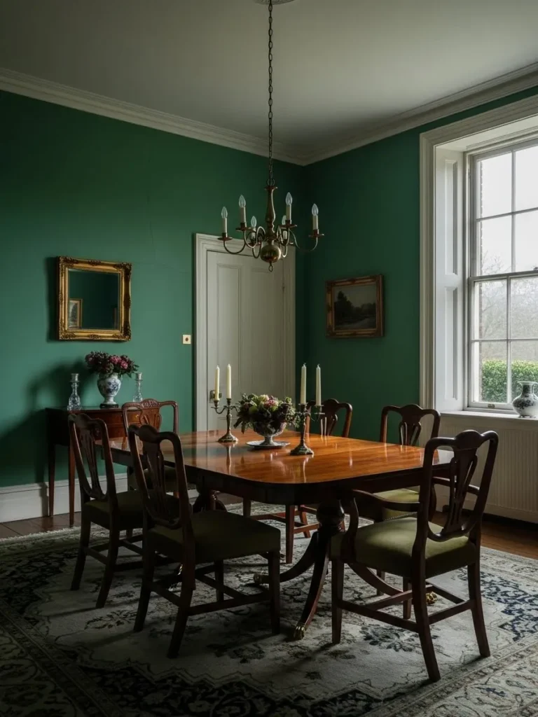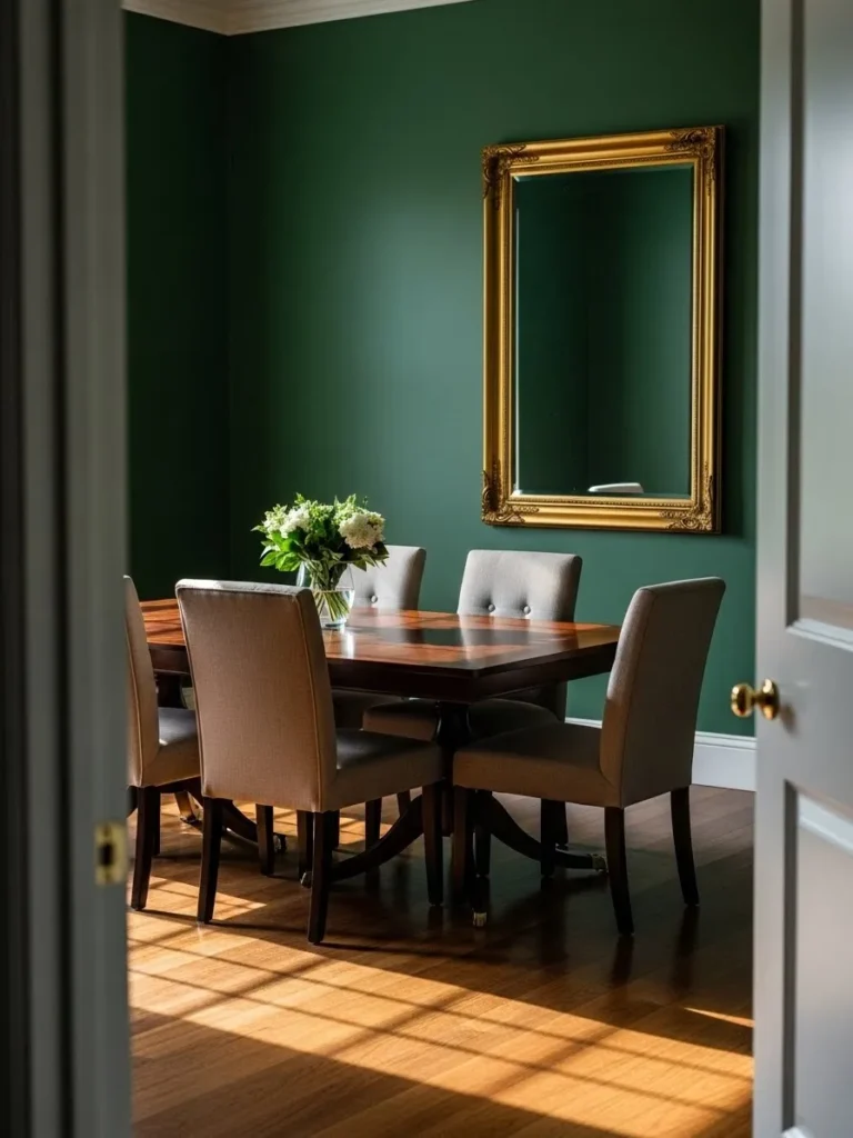 This dining room features emerald green walls paired with warm wood furniture and a classic mirror. The table and chairs feel substantial yet welcoming. Natural light softens the darker color and highlights the textures in the room. The space feels elegant and well balanced.