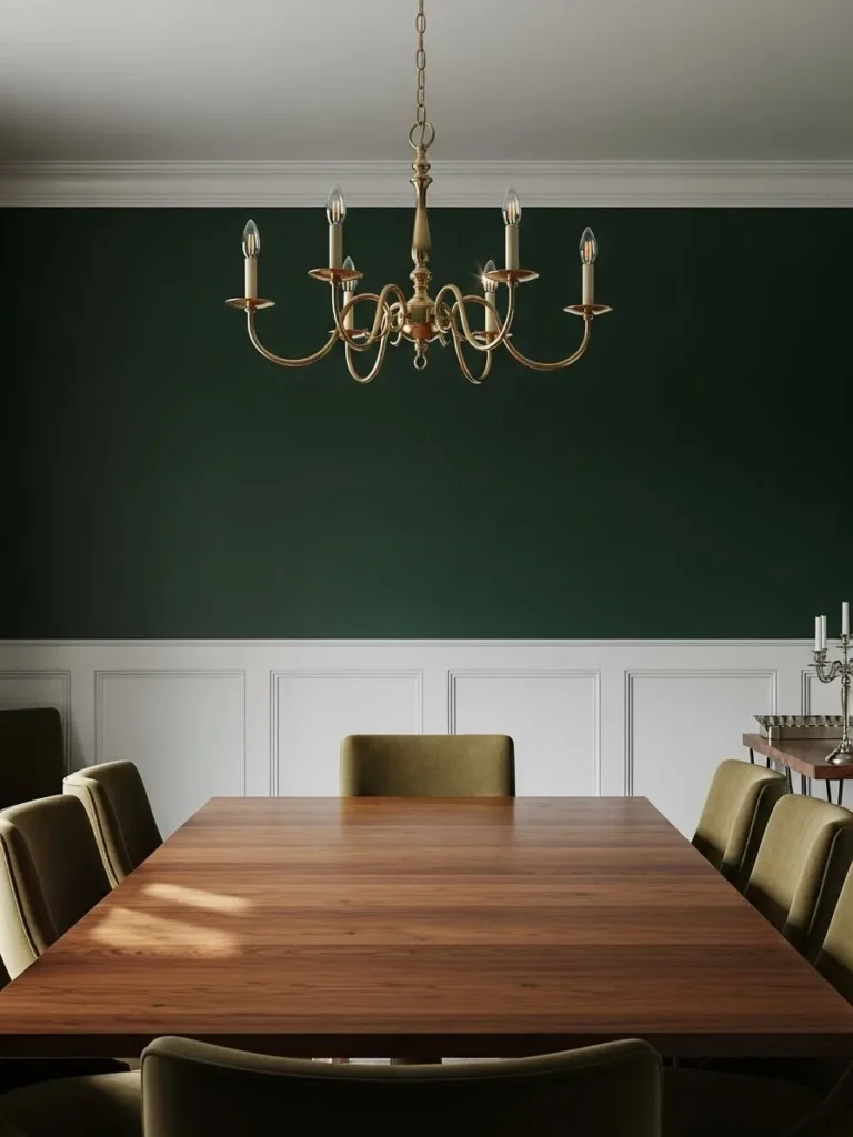 This dining room combines deep emerald green walls with crisp white wainscoting for a balanced and refined look. A long wooden table anchors the room and gives it a sense of structure. The chandelier adds a soft glow that warms up the darker tones. Everything feels symmetrical and calm.