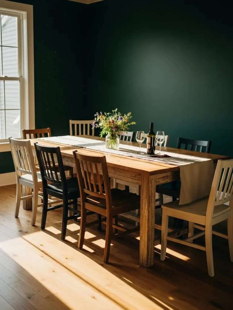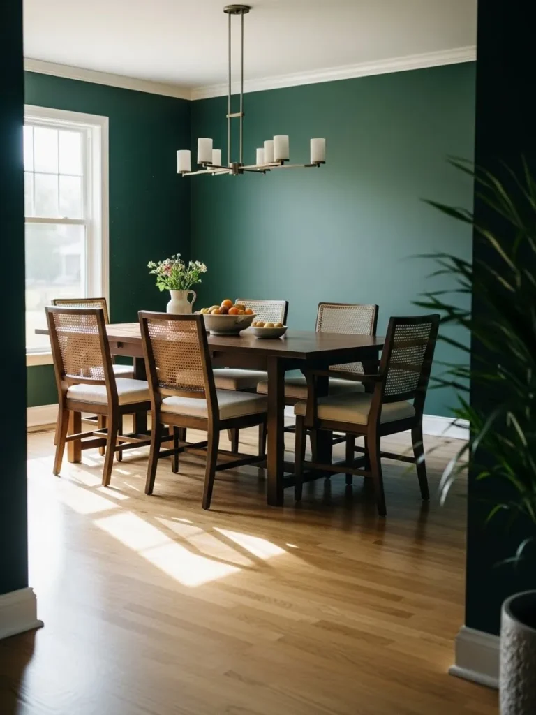 I am drawn to how inviting this room feels. The emerald green adds richness while the warm wood keeps it friendly. It feels like a dining room where conversations flow easily and time slows down just a little.