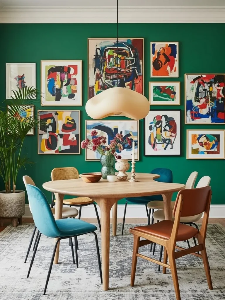 This dining room uses emerald green walls as a bold backdrop for vibrant artwork. A round table and mixed chairs bring in a playful and eclectic feel. The lighting feels soft and welcoming, tying the colors together. The room feels lively and full of personality.