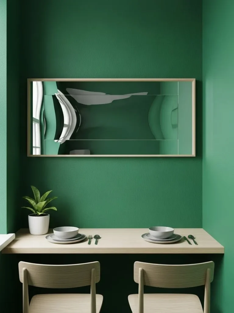 This dining area keeps things minimal with emerald green walls and a slim console table. Clean lines and simple decor create a modern and uncluttered look. A large mirror reflects light and adds depth to the space. The overall feel is calm and intentional.