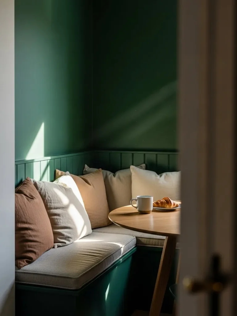 This dining corner uses emerald green walls to create a snug and welcoming atmosphere. Built in bench seating with soft cushions makes the space feel relaxed and lived in. The color wraps around the corner and visually connects the seating area into one cohesive zone. It feels practical while still being stylish.