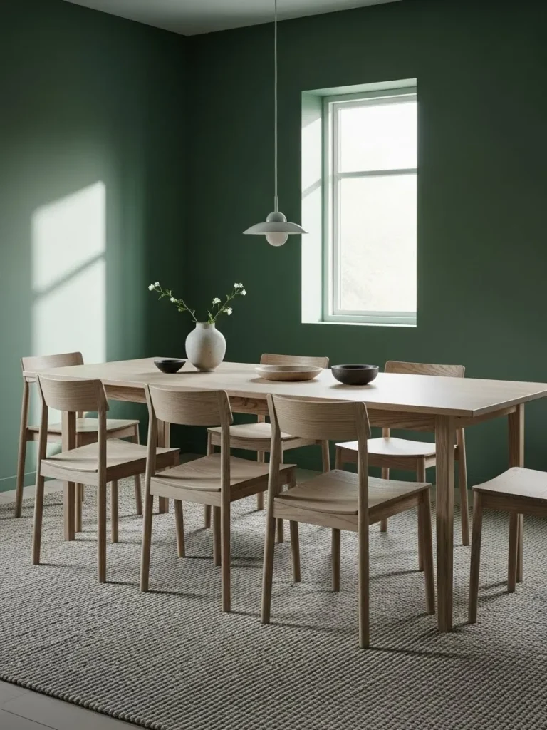 This dining room balances emerald green walls with light wood furniture and plenty of natural light. The long table and simple chairs create a clean and open layout. Soft daylight brightens the green and keeps the room feeling fresh. The overall look is calm, understated, and very inviting.