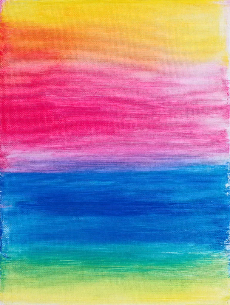 This dreamy design features a smooth transition of colors that reminds me of a summer sunset meeting a tropical ocean. The layout is a vertical stack of horizontal bands starting with a sunny yellow at the top that melts into orange and a punchy pink. In the middle, the pink softens into a light purple before hitting deep blues and teal, then ending with a fresh lime green and yellow at the bottom. The brushstrokes are long and sweeping, which creates a soft texture where the colors overlap on the canvas. Using fluid acrylics is the best way to get this look because their thin consistency allows the pigments to flow together without leaving heavy ridges or lumps.