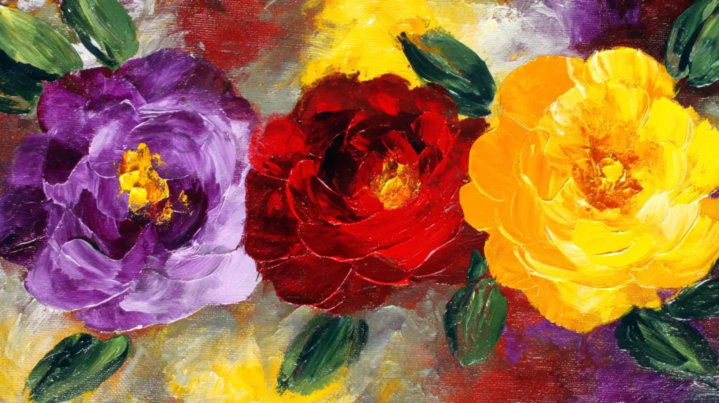 This charming bouquet features three large and lush flowers nestled together against a moody and deep burgundy backdrop. The composition is centered with a fiery orange bloom on the left and a sunny yellow one on the right, while a magnificent magenta flower sits proudly at the bottom. Small and dark teal leaves peek out from behind the petals to add a bit of contrast and movement to the layout. Each petal is defined by curved and confident brushstrokes that create a sense of fullness and life within the blooms. Using satin acrylics is a fantastic choice for this style because they offer a beautiful mid-sheen finish that isn’t too glossy but still makes those rich floral colors look incredibly professional and high-end.