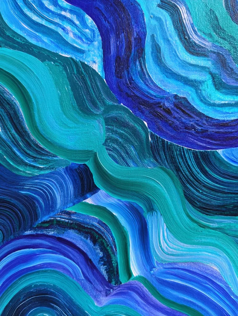 This captivating abstract design mimics the hypnotic movement of deep-sea currents with a complex layout of interlocking waves. The composition is a rich tapestry of teals, royal blues, and icy aquamarine shades that flow across the canvas in a rhythmic pattern. Each wave is defined by dense and sweeping brush strokes that reveal fine lines within the paint to suggest foam and motion. The overall arrangement feels organic and powerful, with different blue tones overlapping to create a sense of immense depth. To achieve such high color saturation and clarity, you really should use professional-grade acrylics because they contain a higher concentration of pigment that stays vibrant even when layered or mixed.