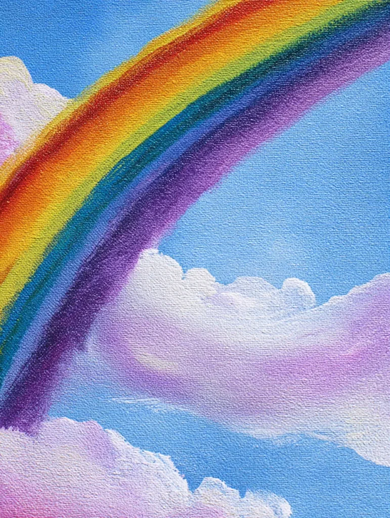 This stunning design showcases a brilliant rainbow arching boldly across a bright blue sky filled with puffy white clouds. The composition features a thick and vibrant rainbow on the left that includes deep red, bright yellow, and lush green bands that fade into a soft purple at the bottom edge. Below the arch, several large and rounded clouds in shades of lavender and pale pink create a soft and dreamy foundation for the scene. The brush strokes are broad and follow the curve of the rainbow, while the clouds are painted with swirling and circular motions to give them a fluffy and voluminous texture. High flow acrylics are an excellent choice for this piece because their ink-like consistency allows you to drop color into wet areas for that beautiful, blurred edge on the purple band and the soft shadows within the clouds.