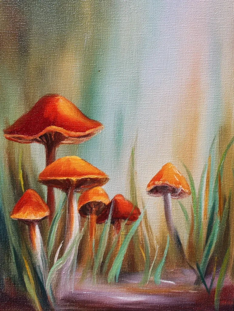 This magical little scene features a cluster of whimsical mushrooms with pointy caps growing tucked away in a soft, grassy meadow. The composition centers on a large and bold red mushroom on the left that stands tall above smaller orange and rusty brown companions. Light and wispy blades of green grass sprout up around the stems to create a sense of height and natural movement. The background is a dreamy and hazy blend of soft cream and muted forest green with vertical brush strokes that look like sunlight filtering through distant trees. To give those mushroom caps a truly otherworldly and mystical shimmer, you should definitely try interference acrylics. These special paints add a flip of color that appears as a glowing highlight when the light hits the curved surfaces of your mushrooms just right.