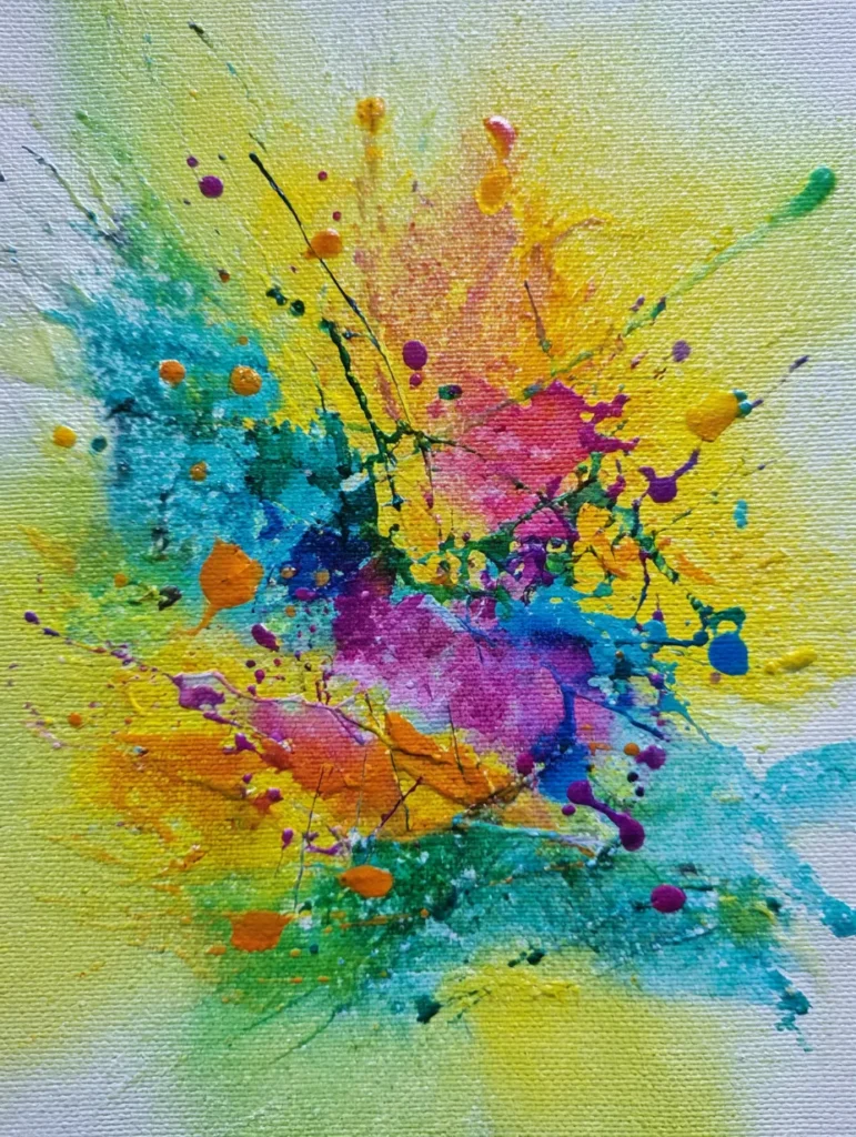 This explosive abstract design feels like a celebration of color captured mid-air on a crisp white canvas. The composition features a central cluster of vibrant magenta and deep violet that radiates outward into splashes of sunny yellow, bright orange, and cool teal. The layout is wonderfully chaotic with thin drips and thick droplets of pigment creating a sense of rapid movement and energy. Rather than traditional brush strokes, the texture comes from the way the paint hits the surface in varying sizes of dots and fine mists. You should definitely experiment with spray acrylics to master this look because they give you that perfect misted background and the ability to layer bold pops of color with total spontaneity.