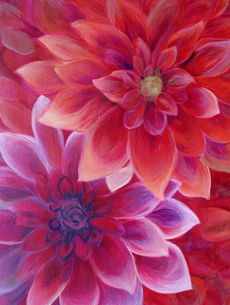 This stunning close-up features two massive dahlia flowers that fill the entire frame with their intricate and pointed petals. The top flower is a fiery explosion of coral and deep red with a warm yellow center, while the bottom bloom shows off a romantic mix of magenta and violet. The composition is tight and focused, which makes you feel like you are standing right in the middle of a summer garden. Each petal is defined by short and curved brush strokes that layer on top of one another to create incredible depth and texture. To make these petals look as fresh and dew-kissed as they do in nature, you should use gloss acrylics. This specific paint type provides a high shine finish that reflects the light beautifully and makes those rich floral pigments look extra vibrant on your canvas.