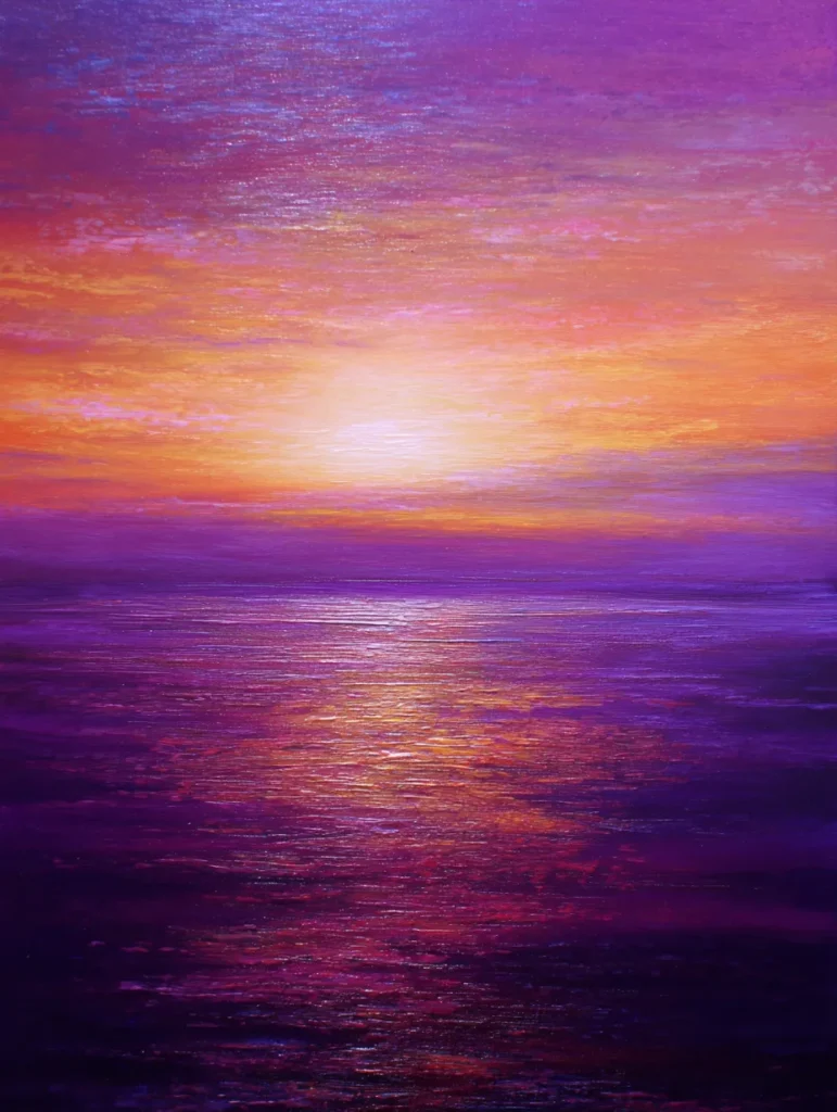 This moody and atmospheric scene captures a shimmering sunset reflecting over a calm and vast ocean. The composition is divided horizontally with a bright, glowing sun nestled among orange and peach clouds in the top half, while the bottom half is filled with deep violet and plum water. Small and thin horizontal brush strokes create a flickering texture on the surface of the sea to represent the dancing light of the setting sun. To get that extra bit of magic on the water, you should use iridescent acrylics because they contain mica or pearl pigments that catch the light at different angles. This makes the reflections on your canvas actually sparkle and change as you walk past the painting, just like real sunlight hitting the waves.