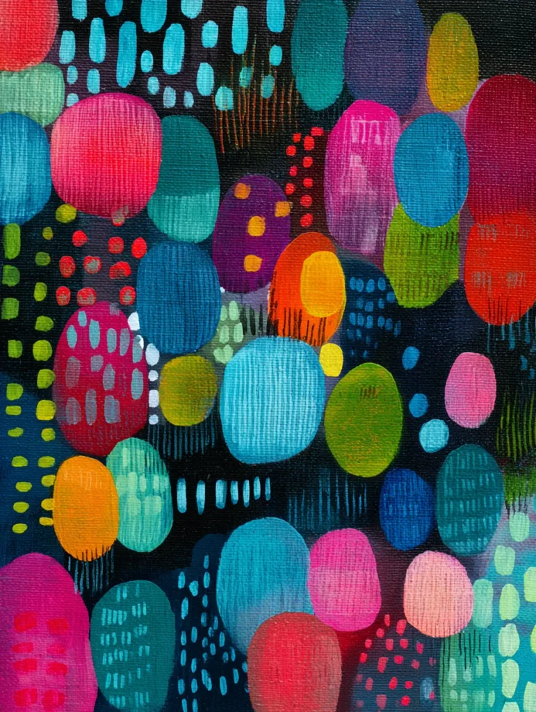 This playful abstract design looks like a collection of colorful river stones scattered across a dark and mysterious forest floor. The composition is packed with overlapping ovals and circles in a rainbow of shades like hot pink, sunny orange, bright teal, and lime green. Small dashed lines and tiny dots fill the spaces between the larger shapes to create a sense of movement and intricate detail. The background is a solid and deep black, which makes every single pop of color stand out with incredible intensity. The brush strokes are precise and controlled with very little blending between the shapes to keep the edges crisp. You should reach for acrylic gouache for this project because it offers a super flat and velvet-like finish with total opacity. This means you can layer light colors right on top of that dark black background without the colors looking streaky or thin.