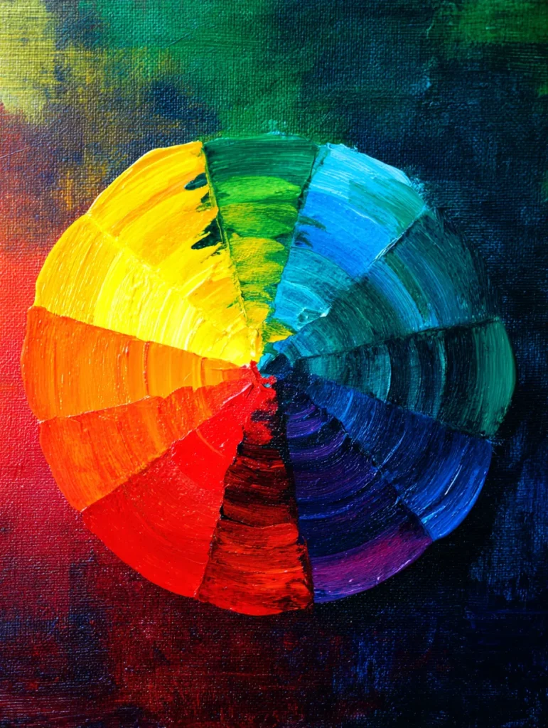 This stunning design features a circular color wheel that literally pops off the canvas with thick and juicy layers of pigment. The composition centers on a multi-hued sunburst of primary and secondary colors, including buttery yellows, fiery reds, and deep oceanic blues. Each slice of the wheel is created with short and curved strokes that leave behind visible ridges and peaks for a wonderful 3D effect. The background is a dark and moody blend of forest green and navy, which makes the bright center appear even more luminous. You definitely want to reach for heavy-body acrylics for a project like this because their buttery and thick consistency holds those beautiful brush marks perfectly as they dry.