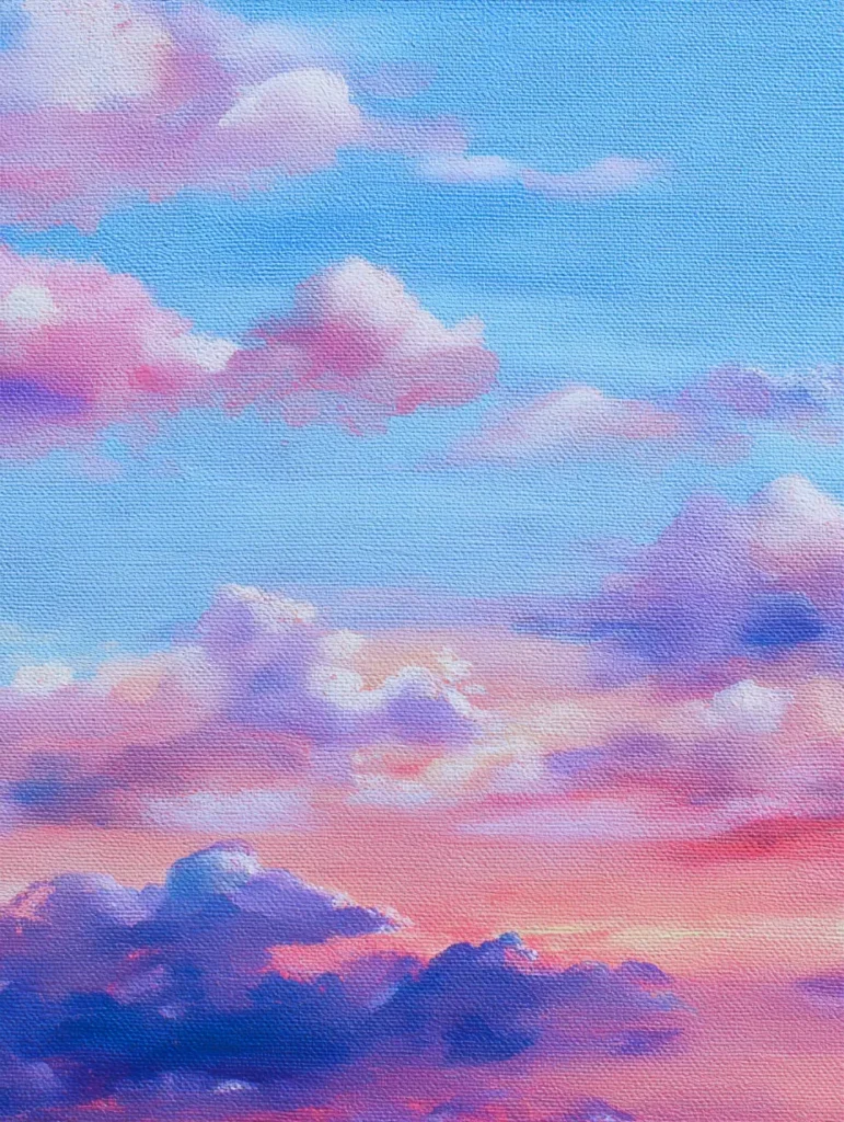 This breathtaking sky design features fluffy and lighthearted clouds that look like soft cotton candy drifting through a bright morning. The composition is layered with various clusters of pink and lavender clouds that fill the lower half of the frame against a crisp and clear baby blue sky at the top. Each cloud is rendered with swirling and circular brush strokes that create a wonderful sense of volume and softness, while the colors blend from a deep violet at the bottom to a pale peach near the horizon. The layout feels vast and open, which gives the whole piece a very airy and peaceful vibe. You should reach for soft body acrylics to recreate this look because their creamy and smooth consistency makes it incredibly easy to blend these delicate pastel shades without any dragging or harsh lines.
