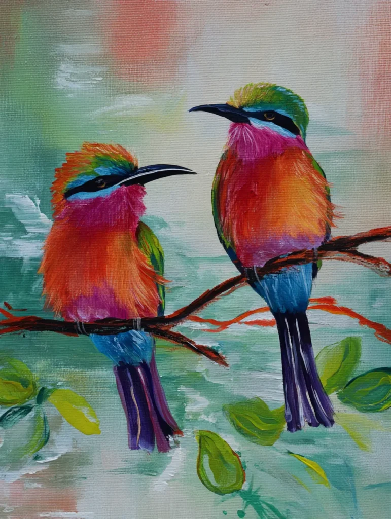 This stunning final piece features two vibrant bee-eater birds perched side-by-side on a slender, dark brown branch. The composition is bright and lively, with the birds angled slightly toward each other against a soft, hazy background of mint green and peach. Their plumage is a magnificent explosion of color, transitioning from lime green and golden yellow on their heads to fiery orange chests and deep blue and purple tail feathers. Fine, feathered brush strokes give their bodies a realistic texture, while the leaves below are painted with quick, gestural marks. To capture the intense brilliance and fine details of these exotic birds, you should use artist-grade acrylics. These paints have the highest pigment concentration, ensuring that your bold oranges and teals remain striking and do not fade as they dry.
