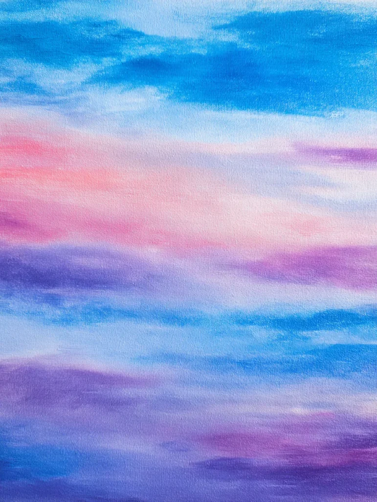 This airy composition looks just like a snapshot of a peaceful morning sky filled with weightless clouds. The layout uses horizontal wisps of sky blue and light turquoise at the top that transition into delicate peach and baby pink tones in the center. Toward the bottom, the colors deepen into a lovely lavender and soft violet. The brushstrokes are feather-light and blurred, which gives the whole piece a hazy and romantic feel. You should try using open acrylics for this technique because they have a much slower drying time than standard paints. This extra time allows you to keep blending those soft edges until they look perfectly seamless and misty.