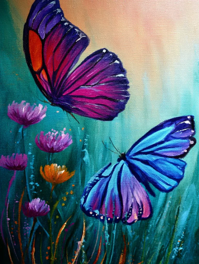 This enchanting scene features two large butterflies fluttering gracefully over a cluster of delicate wildflowers. The composition draws your eye diagonally across the canvas with a vibrant purple butterfly at the top and a brilliant blue one sweeping toward the bottom right. The background is a magical blend of deep teal and soft emerald green with vertical brush strokes that mimic tall blades of grass under a glowing peach sky. Each wing is detailed with fine black lines and tiny shimmering spots, while the flowers below pop in shades of violet and golden orange. Adding iridescent acrylics to your palette for this project is a total game-changer because it gives the butterfly wings and flower petals a pearly glow that changes as you move past the painting.