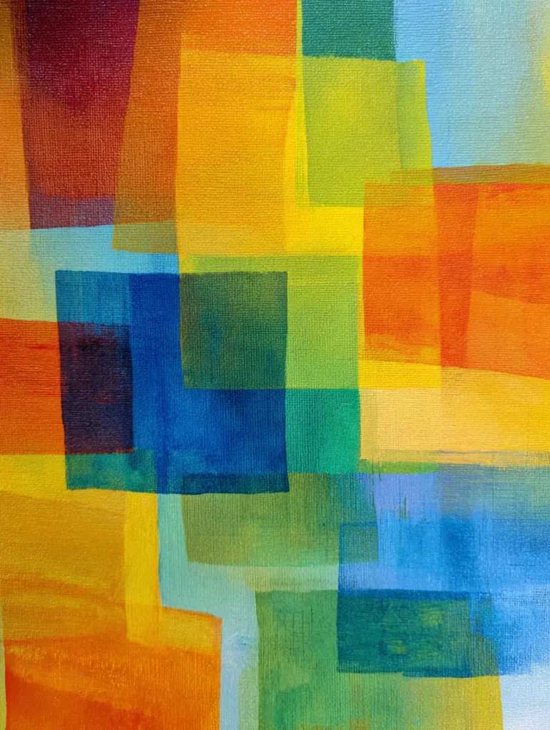 This vibrant abstract piece features a playful patchwork of overlapping rectangles and squares that create new colors wherever they meet. The composition is a lively mix of sunshine yellows, bold oranges, and cool azure blues that seem to dance across the canvas in a random but balanced layout. Each shape is applied with clean and straight edges, while the brush strokes remain thin and even to keep the colors looking like stained glass. To achieve this windowpane effect, you should definitely use transparent acrylics because they allow the underlying layers to show through perfectly. This creates those gorgeous deep greens and rich purples at the intersections without any muddiness.