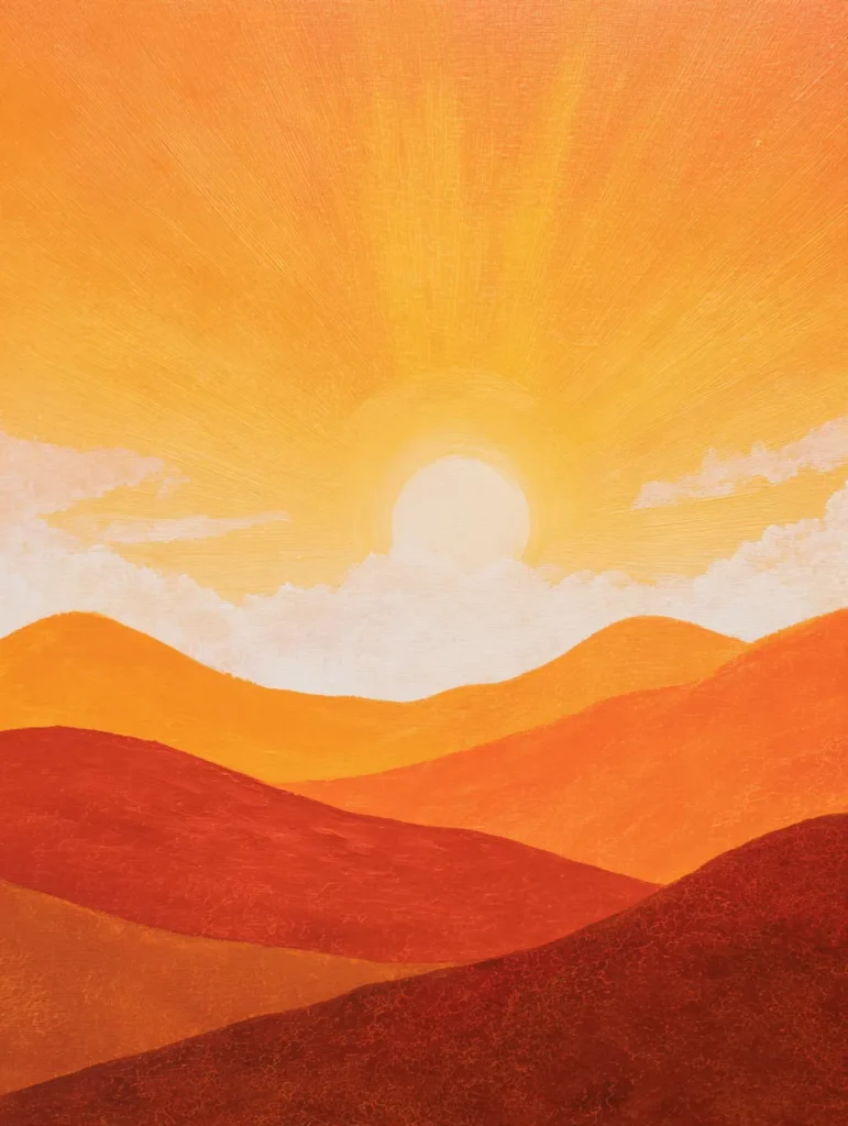 This breathtaking landscape captures the warmth of a glowing sun as it sets behind rolling mountain peaks. The layout is dominated by a brilliant white sun centered in the upper half with rays of light yellow and deep orange radiating outward toward the edges of the frame. Below the sun, soft white clouds float just above layered hills that transition from a bright marigold to a rich terracotta and finally a deep burnt umber in the foreground. The brush strokes are short and directional in the sky to mimic light beams, while the hills feature a smoother and more solid application of color. You should try using gouache acrylics for this look because they provide a stunning matte finish and high opacity that makes these warm desert tones look incredibly velvety and flat without any unwanted shine.