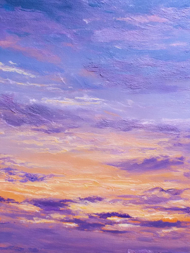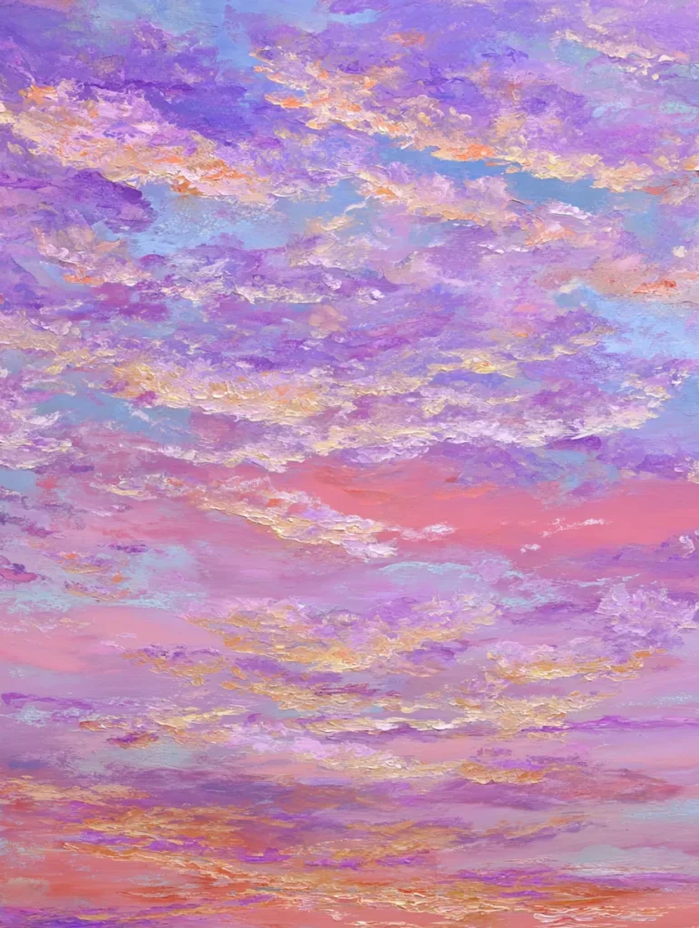 This design features a dreamy explosion of lavender, soft pink, and baby blue tones that dance across the canvas in a beautifully chaotic way. The artist used thick and impasto-style brush strokes to create a rich texture that makes the clouds feel like they are popping right off the surface. There is no strict horizon line, which gives the composition a boundless and ethereal quality. Touches of golden yellow highlight the edges of the clouds as if the sun is just starting to peek through from behind.