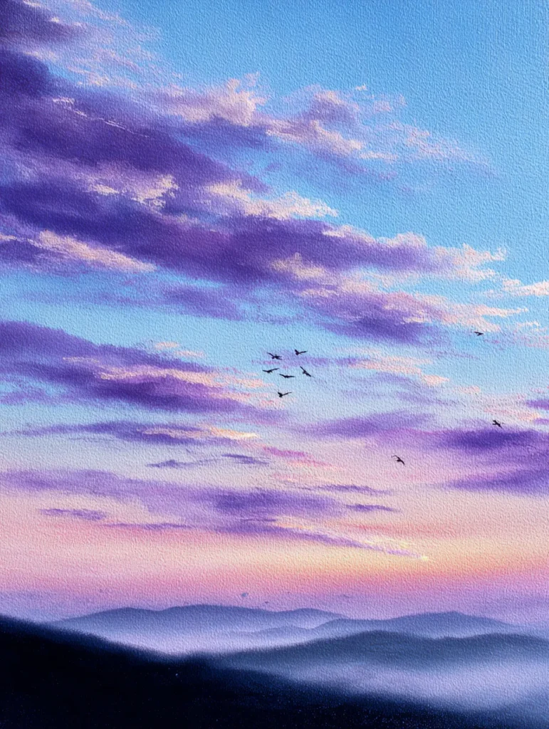 I simply admire the peaceful energy that radiates from this specific color palette. Getting those soft purple gradients just right is such a rewarding way to spend an afternoon with your brushes. It feels like a beautiful escape from a busy day, and the addition of the mountains makes the whole scene feel so vast and full of wonder.