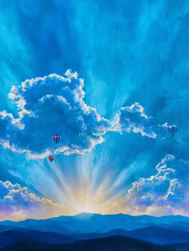 This painting captures a breathtaking celestial moment where bright sunbeams pierce through a brilliant turquoise sky. The composition centers on a glowing white sun tucked behind rolling blue mountain silhouettes, creating a dramatic upward spray of light. Fluffy, white-edged clouds with deep cerulean shadows float gracefully in the foreground, while tiny hot air balloons add a whimsical touch of scale. The artist used soft, blended strokes for the light rays and more textured, circular motions to give the clouds their puffy, three-dimensional look.