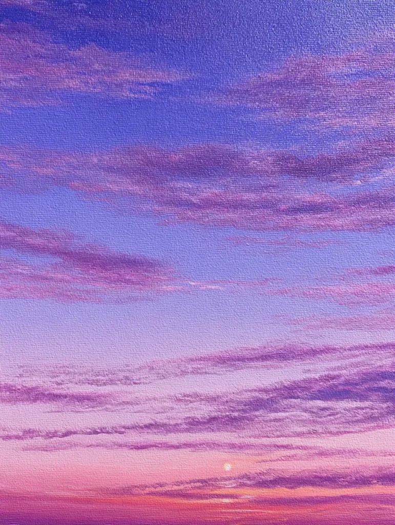 This dreamy piece features a breathtaking gradient of violet and periwinkle that flows seamlessly into a warm, rosy pink at the horizon. The composition is built with horizontal layers of streaky clouds created by soft dabbing and dragging motions of a flat brush. A tiny glowing sun sits perfectly at the bottom center, providing a focal point that ties the entire sky together. The texture of the canvas adds a wonderful graininess to the light purples, making the whole scene feel like a cozy blanket.