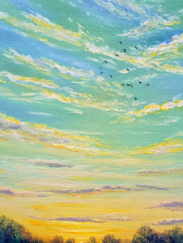 This refreshing composition blends a soft mint green sky with sunny yellow accents and crisp white clouds. The layout follows a diagonal movement where wispy cloud formations sweep from the top right down toward the center. Small black silhouettes of birds in flight add a dynamic touch of life to the upper half of the canvas. The bottom is anchored by a warm golden horizon and detailed silhouettes of leafless trees that give the piece a crisp autumnal or early spring feel.