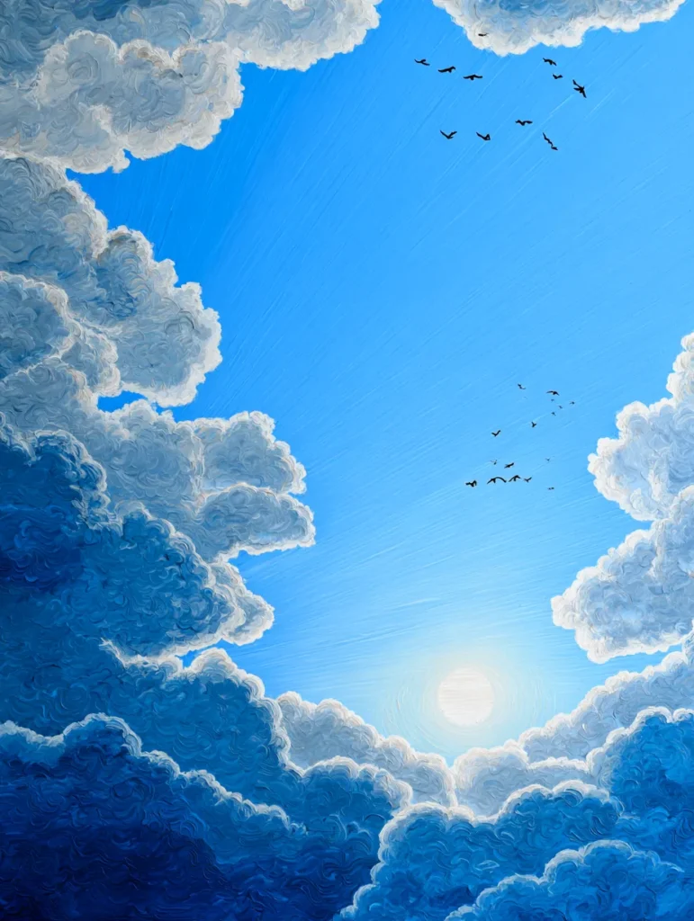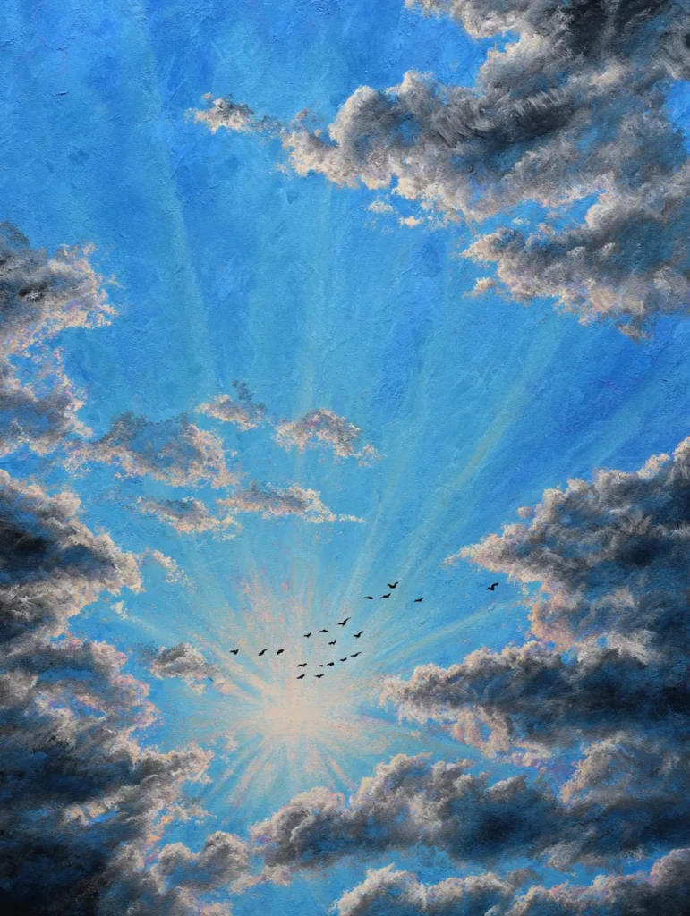 This composition is absolutely breathtaking with its brilliant sky blue backdrop and radiant sunbeams stretching toward the corners. Darker, slate-gray clouds frame the scene like a natural window, while tiny black bird silhouettes drift toward the glowing center. The artist used a mix of smooth, blended strokes for the light rays and textured, swirling motions to give the clouds their realistic depth. It has a vertical layout that pulls the eyes upward, creating a sense of immense height and open space.