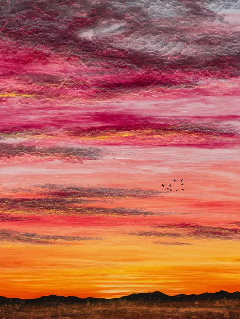 The canvas showcases a dramatic transition from a heavy charcoal and deep plum top into vibrant magenta and fiery orange bands toward the bottom. This layout is defined by thick horizontal layers of clouds that possess a ruffled and woolly texture created through dense stippling and repetitive dabbing. A small circular cluster of birds provides a focal point in the middle section, while the base is anchored by a sharp black mountain range silhouetted against a glowing tangerine horizon. The contrast between the dark peaks and the electric pinks creates a high-energy atmosphere that feels both bold and mystical.