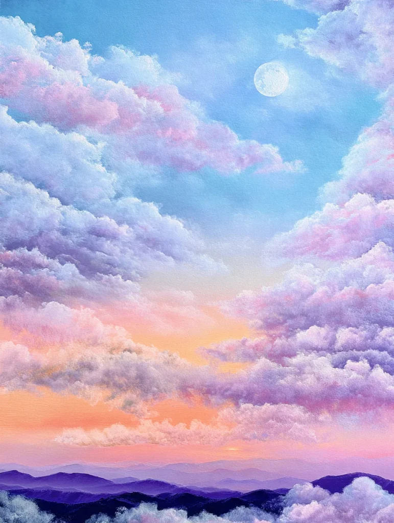 This vertical layout features a breathtaking sky filled with massive billowy clouds in shades of lavender and soft petal pink. The composition uses a classic V-shape with the clouds flanking the sides, while a pale blue opening in the center reveals a delicate full moon. To achieve this look, you would use circular buffing motions with a large round brush to create those soft, puffy edges and light layering for the peach glow near the horizon. At the very base, a series of rolling mountain peaks in deep violet provides a sturdy contrast to the airy and light pastel tones above.