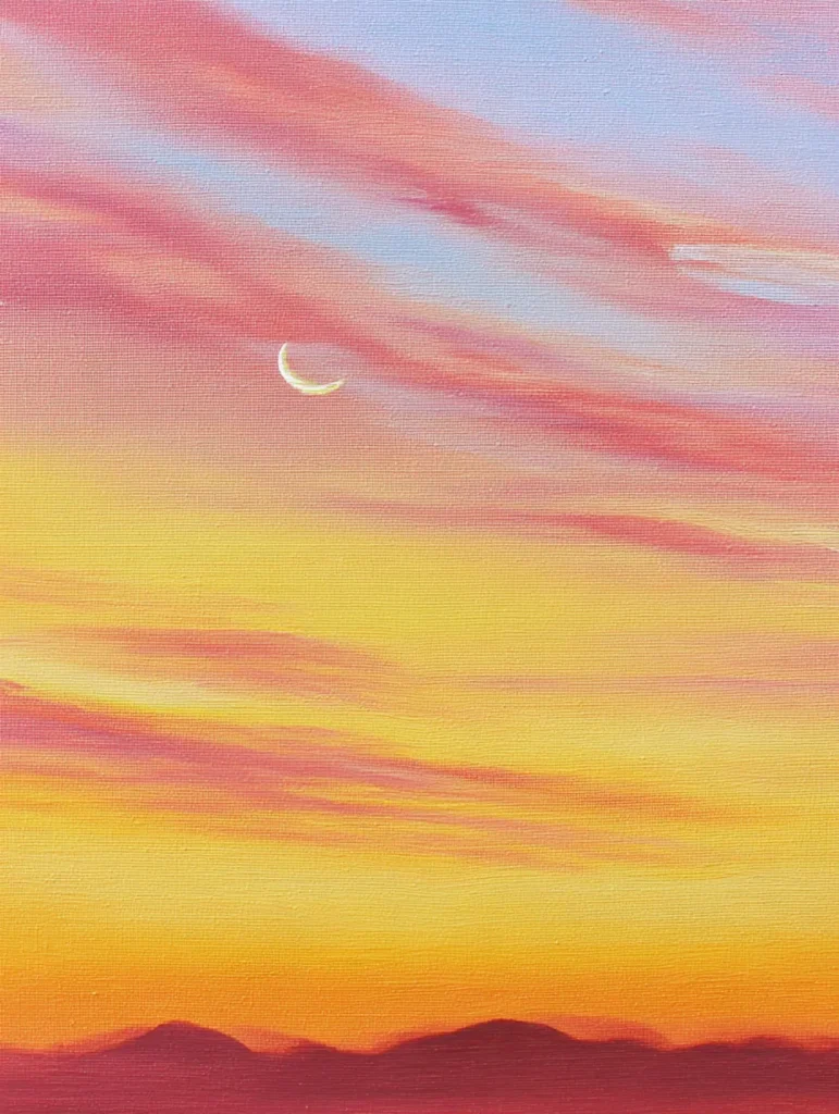 I admire how this color palette feels like a warm summer evening. Trying out these long, blended strokes is a fantastic way to clear your head because the movement is so repetitive and calming. You will love how the tiny moon adds that extra bit of whimsy to an otherwise simple and elegant sunset scene.