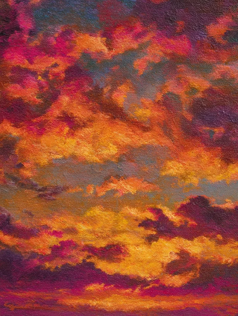 This design features a dreamy explosion of warm tones like fiery orange, golden yellow, and deep magenta. The composition is packed with fluffy, billowy clouds that stretch across the entire canvas, giving it a rich and textured feel. Short, dabbing brushstrokes create a wonderful sense of movement and volume. It looks like the sky is literally glowing from within as the sun dips below the horizon. The layout feels very intimate because the focus remains entirely on the colorful atmosphere without any distracting landscapes.