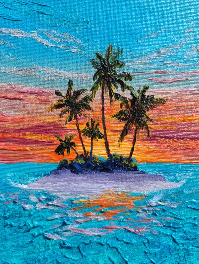 This vibrant design features a tiny island oasis nestled in a sea of textured turquoise water. The artist used thick impasto brushstrokes to create a sense of movement in the waves and a dreamy glow in the sky. Warm shades of orange, pink, and deep magenta blend to form a stunning sunset backdrop for the dark palm tree silhouettes. The composition centers on a group of five palm trees of varying heights, grounded on a small patch of purple and blue land. White and orange highlights dance on the surface of the water, mimicking the reflection of the setting sun and the foam of the sea.