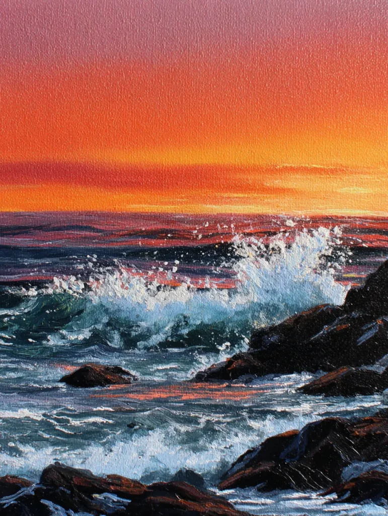 Capturing the raw power of the ocean on such a small scale is a thrill. You can really let your emotions flow as you slap on that thick white paint to build up the splashing waves against the dark stones. If you’re into high-energy art sessions, this design provides a wonderful outlet for expressive and bold movements. It feels incredibly satisfying to see that bright orange sky reflect so beautifully in the ripples of the water below. This piece is a fantastic way to experiment with texture and light to create a scene that truly feels alive.