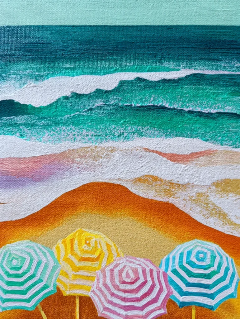 This cheerful beach scene captures the bird’s-eye view of a bright sandy shore lined with striped umbrellas. The artist used a refreshing palette of mint green, teal, and deep ocean blue for the water, applying thick white paint to represent the frothy crests of the waves. In the foreground, four parasols in shades of lemon yellow, candy pink, and seafoam green create a playful geometric pattern against the warm ochre sand. The composition is layered horizontally, leading from the colorful beach gear up through the crashing surf to a calm and pale turquoise sky. Every stroke on the umbrellas is deliberate and textured, giving them a lovely tactile quality that stands out against the smoother sand.