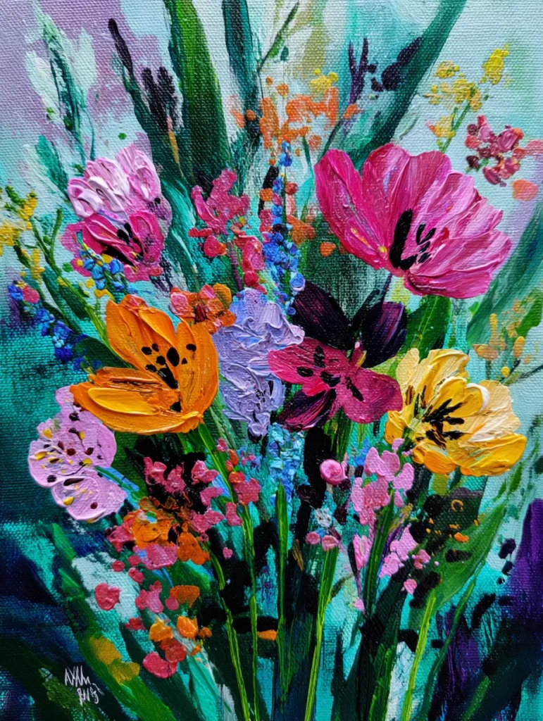 This energetic floral arrangement features a wild mix of tulips and dainty blossoms set against a moody teal and lavender backdrop. The artist utilized heavy impasto techniques, leaving thick ridges of paint that make the orange and fuchsia petals practically jump off the canvas. Deep purple and sunshine yellow flowers provide a beautiful contrast, while slender green stems and tiny blue buds fill in the gaps with a sense of natural movement. The composition is a vertical explosion of life, with the taller flowers reaching toward the top corners and smaller sprays of coral and pink scattered throughout the center.