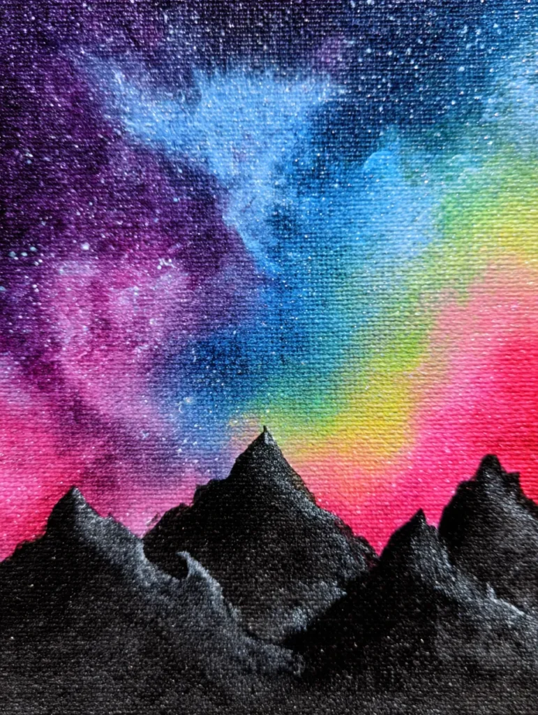 The contrast between the flat, dark mountains and the luminous, shimmering sky makes this piece feel incredibly powerful. I am genuinely fascinated by how a few simple black shapes can make such a dramatic impact when paired with a bold background. This is a brilliant way to practice your blending techniques because the transitions don’t have to be perfect to look intentional and ethereal. You will find that flicking those little white stars onto the canvas is a super fun way to add that final touch of magic. It is such a rewarding project for a quick creative win that looks absolutely professional.