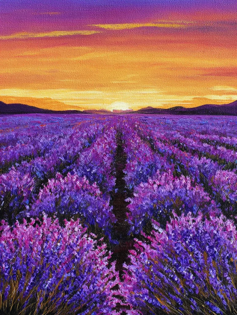 This breathtaking landscape presents a vast expanse of purple lavender rows stretching toward a distant horizon where the sun is just beginning to set. The sky is a gorgeous blend of deep plum, burnt orange, and soft gold, with thin horizontal clouds catching the final rays of light. To create the lavender, the artist used dabs of varying shades of violet and fuchsia, building up a rich texture that mimics the fluffy appearance of the blooms. The composition uses a strong central perspective, with a dark path cutting through the middle of the field to pull your eye toward the glowing sun nestled between soft mountain silhouettes.