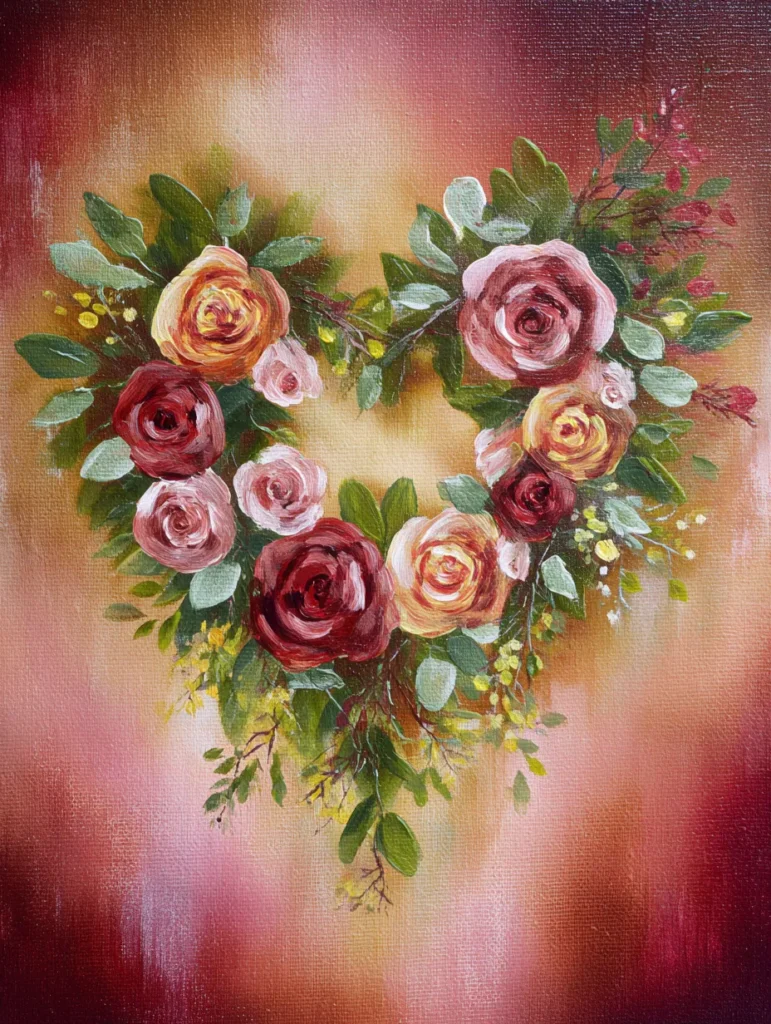 This romantic design features a lush collection of roses and greenery meticulously arranged into a heart shape. The artist used soft and circular brush movements to build the layers of the flower petals in shades of deep burgundy, dusty rose, and warm apricot. Touches of sage green leaves and tiny yellow sprigs frame the blossoms, adding a natural and garden-fresh feel to the composition. The background is a dreamy and blurred wash of cream and terracotta that makes the central wreath glow. Every bloom is placed with care to maintain the perfect heart silhouette while keeping a loose and painterly style that feels effortless.