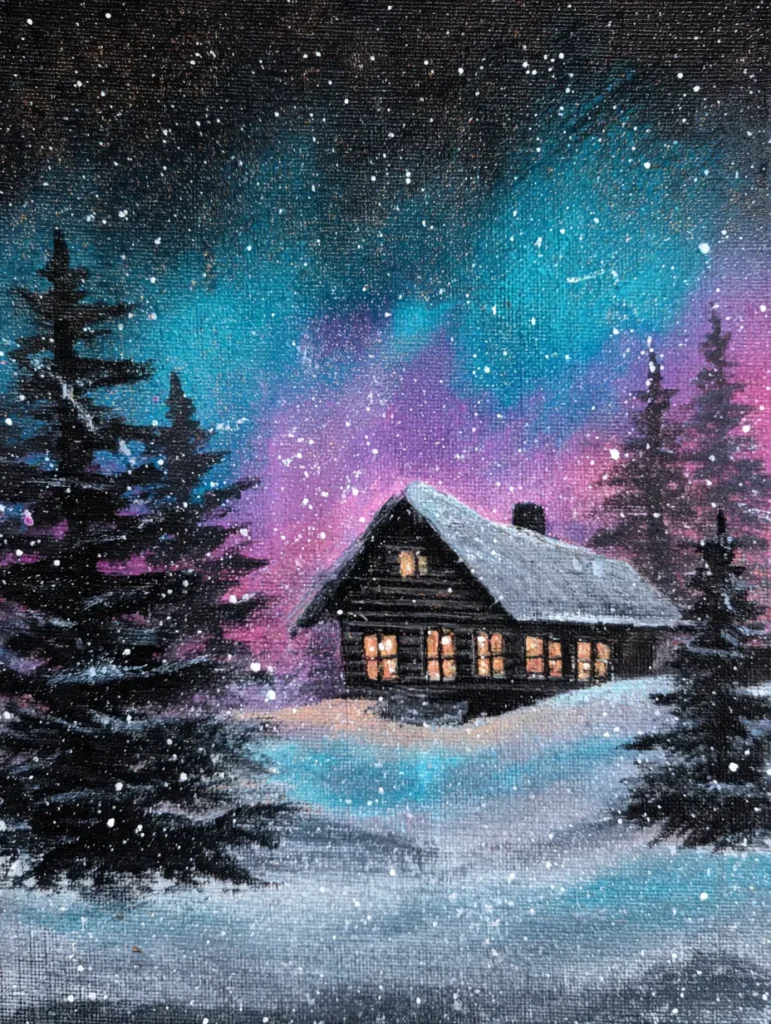 I love how this design manages to feel both cold and incredibly warm at the same time. It is a fantastic choice if you want to play with light effects and experiment with creating that soft, diffused glow from the windows. The process of splattering the “stars” and “snow” is quite liberating and adds a playful touch to your painting session. You will likely find the mix of structured cabin lines and loose, ethereal sky movements to be a very satisfying creative challenge.