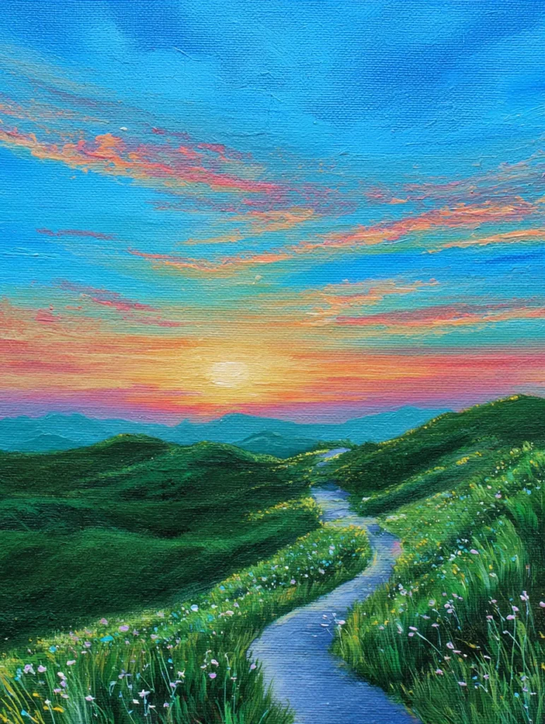 This serene landscape features a winding gray path that meanders through lush, rolling green hills toward a glowing sunset. The artist used vibrant shades of emerald and forest green for the hills, dotting the foreground with tiny, delicate wildflowers in pale pink, blue, and white. Above the distant teal mountain silhouettes, the sky transitions into a stunning gradient of fiery orange, soft pink, and bright yellow where the sun sits low on the horizon. Wispy clouds streaked with coral and gold stretch across a clear cerulean sky, creating a sense of vast, open space. The composition uses the curving path as a lead-in line, drawing your eye directly into the heart of the warm, tranquil light.