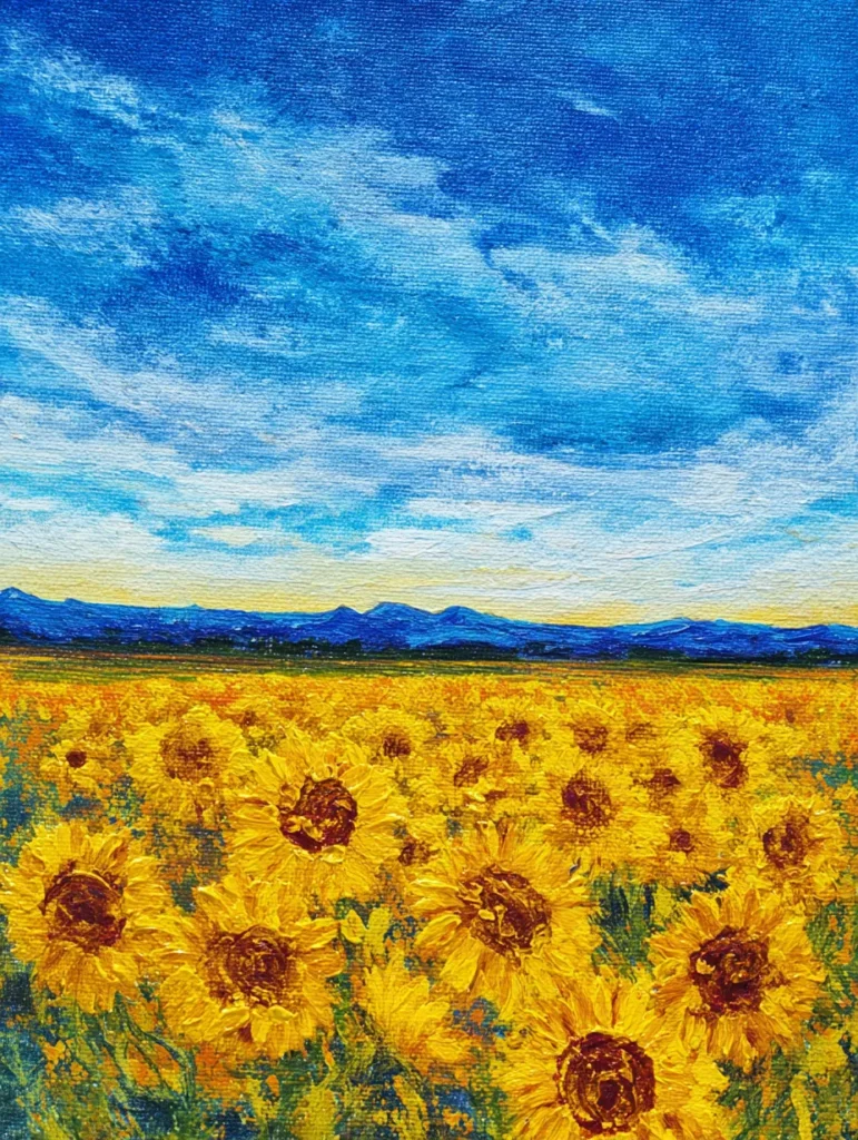 If you are looking for a project that feels like a big warm hug, this floral scene is the one for you. I am captivated by how the bright yellow tones instantly make any space feel ten times sunnier. You can really have a blast with your palette knife or a stiff brush to get those chunky petals looking just right. It is a wonderful way to practice perspective while playing with one of nature’s most iconic flowers. Creating this field feels incredibly rewarding because it is all about loose and expressive movement rather than worrying about perfect symmetry.