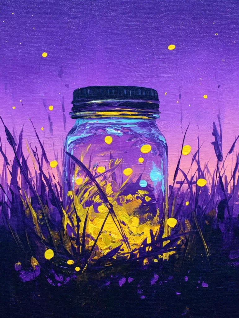 This enchanting design features a glass mason jar glowing with the light of dozens of fireflies captured against a twilight sky. The background is a stunning gradient of deep violet and soft lilac, while dark purple grass blades frame the bottom of the jar. Bright yellow and gold dabs of paint create the fireflies, appearing both inside the glass and floating freely in the air. The artist used energetic, thick strokes of white and light blue to give the jar a reflective, glass-like sheen, making the golden light within seem to shimmer and pulse. The central composition keeps the focus entirely on the jar, making it feel like a tiny beacon of light in a mysterious garden.